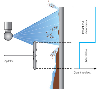 Debris can collect around and under agitators & baffles making it difficult to clean. If the residue is light to moderate your nozzle may be able to clean it. However, if your residue is thicker you may need to place another nozzle inside the tank to clean that area effectively.