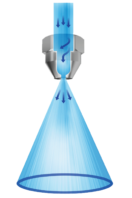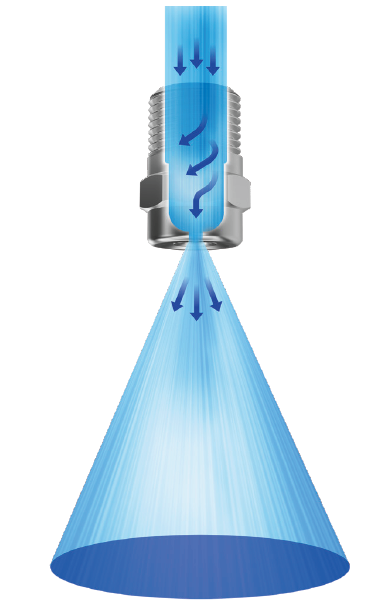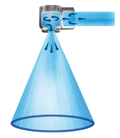![]() | The most common full cone is axial, this design creates an even spray over a circular area. Spray formation, liquid distribution, and shaping of droplets are generated by a revolving motion of the liquid, which is achieved with the aid of swirl inserts inside the free cross-section of the nozzle. The axial full cone is available with low and high flow rates in a wide range of spray angles and is perfect for the following applications: