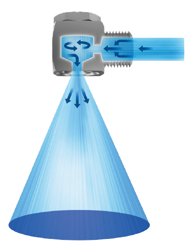 ![]() | The tangential hollow cone is designed with an off center inlet combined with a 90° turn. These internal features create a whirling rotation of liquid within the nozzle chamber resulting in smaller droplets and even distribution. Tangential hollow cone nozzles do not include a swirl insert making them less prone to clogging. Typical applications for tangential hollow cone nozzles include: