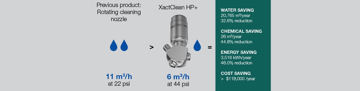 - Comparison of the performance results of the existing rotating cleaning nozzles (competitive product) with the Lechler XactClean HP+