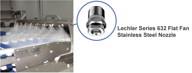 Conveyor belts are commonly used for material handling and as excess dirt and bacteria builds up over time, belts can be difficult to clean. Traditional cleaning methods include power washing; however, this process uses excess water and chemicals. A spray manifold with flat fan nozzles can automate the process and provide reliable cleaning results. Flat fan nozzles provide good spray impact and overlap for complete coverage. The spray manifold is typically placed above and below the conveyor, so that both sides of the belt are accurately cleaned.