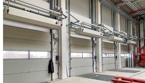 | The loading ramps for the trucks and the corresponding rolling gates have also been installed. Also, the connection to the production building has been realized, so that an optimum material flow from production to the logistics center and back will be possible. A complex sprinkler system ensures that the building and equipment are adequately protected in the event of an emergency. | ![]() |