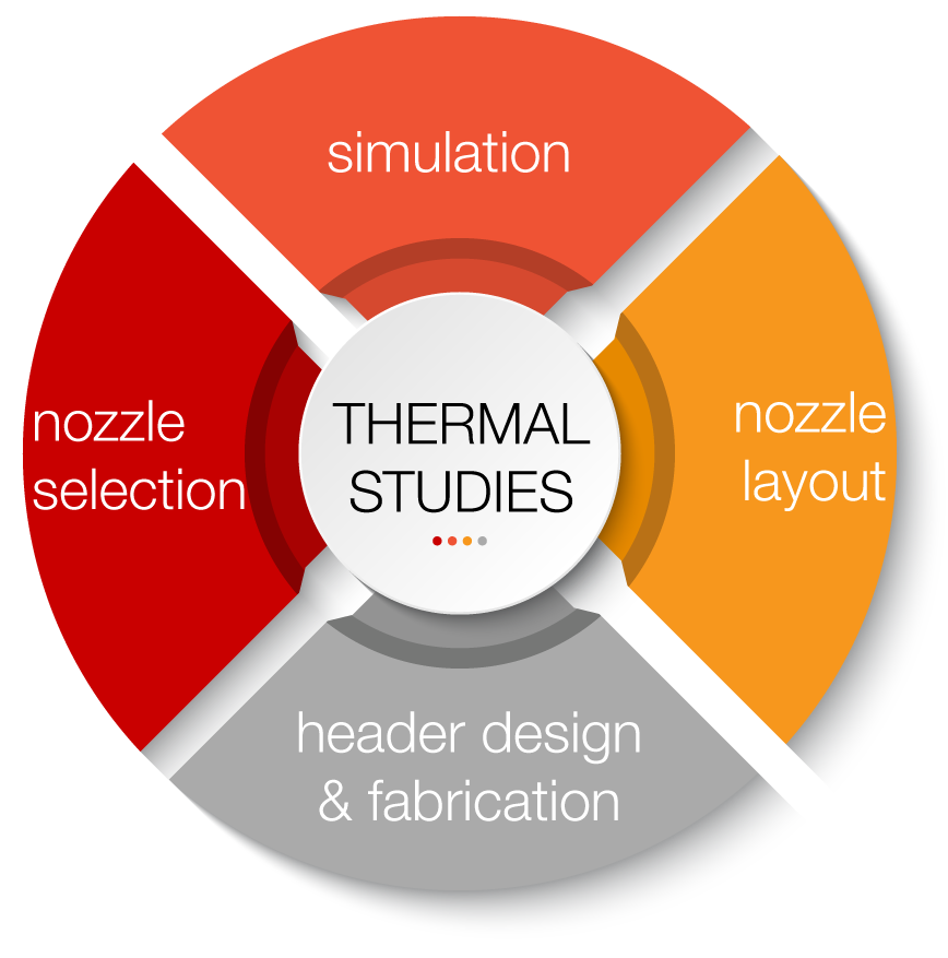 Our study starts by collecting data from your entire process. We then use simulation software to calculate theoretical models. From this data we simulate improvements and determine new nozzle layouts, nozzle design and selection, new header design and fabrication.