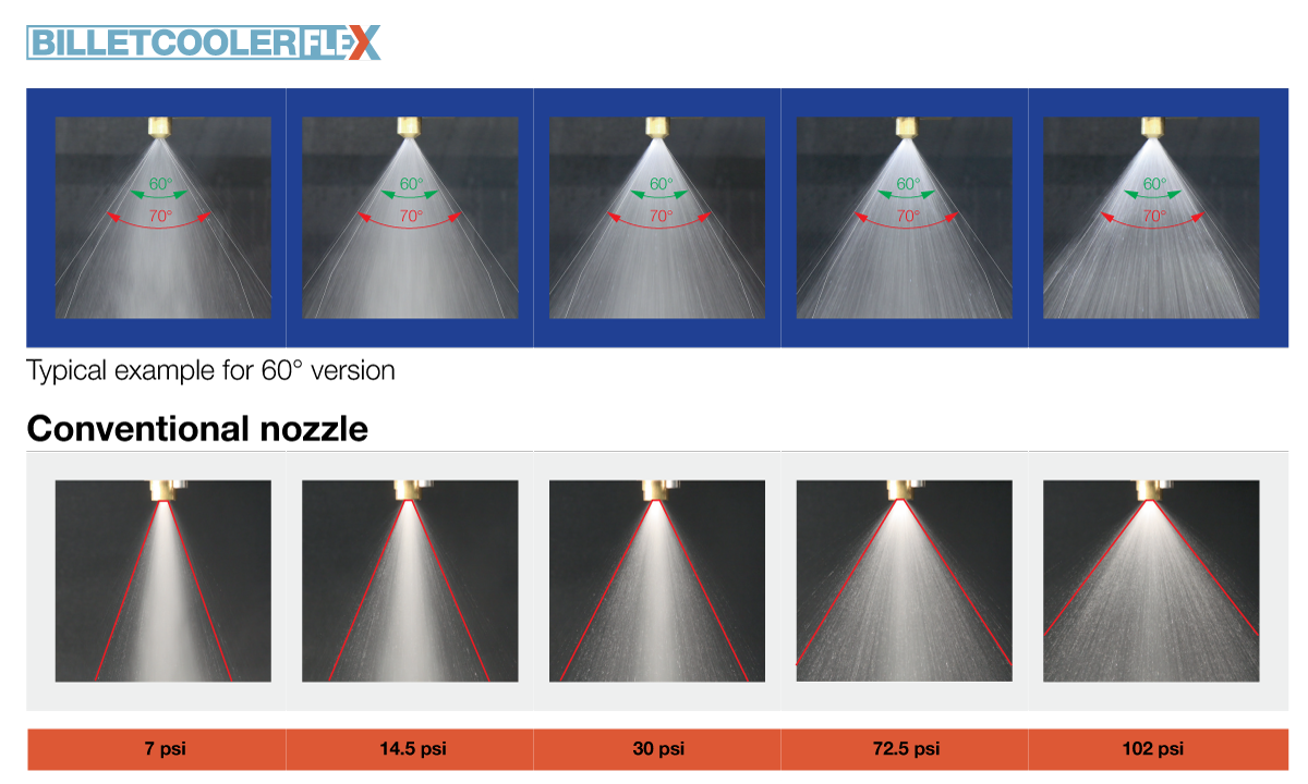 The Billetcooler Flex® is designed with the capability to have a constant spray angle over the entire turn-down range. We offer three different nozzle sizes, each with a turn-down ratio (min./max. water flow rate) of 1:10.The images below represent the comparison of the Billetcooler Flex vs a conventional nozzle.