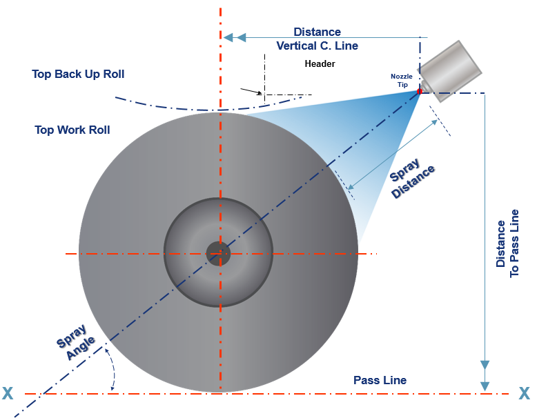 The headers need to be positioned as close to the exit bite as possible. The exit bite is the location in which the highest work roll temperatures occur, so we want to attack and extract the heat before it has time to migrate to the center of the work roll. Difficulties are always present due to mill furniture and other hardware present. An effort needs to be made for positioning of the header.