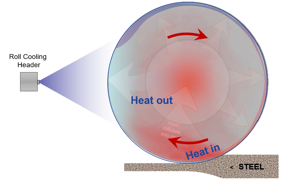 Now lets discuss roll cooling which is the action of applying a coolant solution (water in the case of a Hot Strip Mill-HSM) across the width of a work roll.