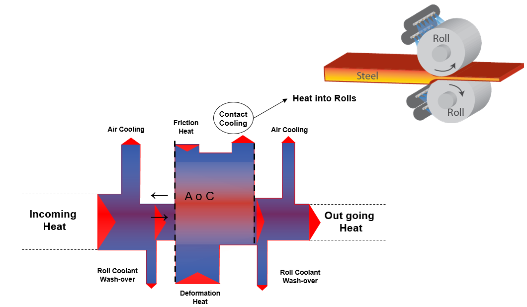 As we move to the move further to the middle, heat builds up in the area of contact due to friction and deformation of the slab while heat is absorbed by the work rolls. Finally after exiting the bite, we loose additional heat to more air cooling and to coolant wash over.