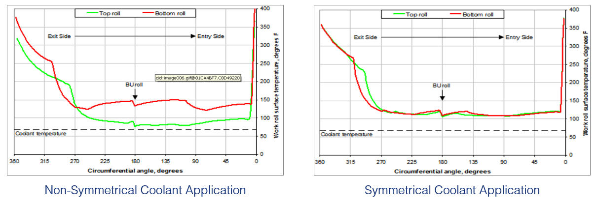 Equal volume and uniform pressure through headers to top and bottom work rolls along with controlled coolant temperatures and cleanliness.