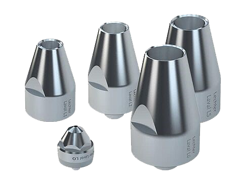 These nozzles atomize liquids as a fine full cone and work on the super-sonic principle. By changing the air/liquid ratio, the droplet size and the droplet spectrum can be adapted within a wide range for special applications.