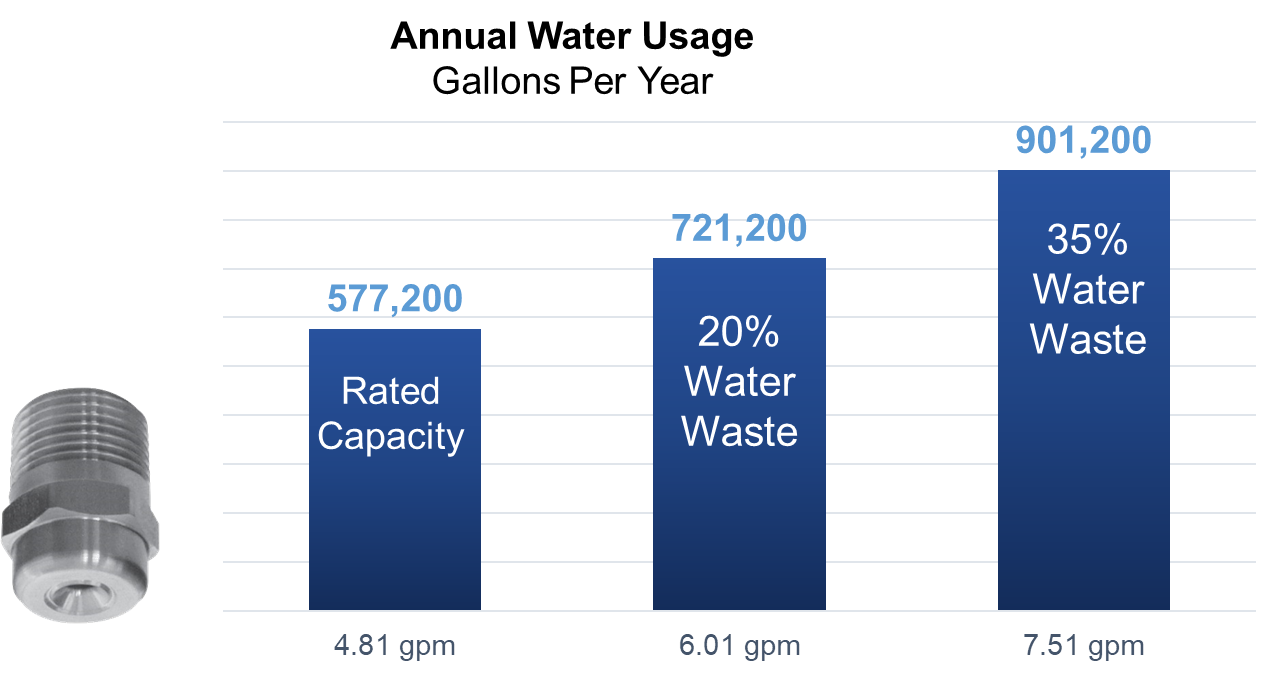In one year, a full cone nozzle rated at a capacity of 4.81 gpm, consumes a total of 577,200 gallons of water.The same nozzle at higher flow rates, will use 20% to 35% more water and as a result more water is wasted in the process. This results in additional cost for water, water treatment and water waste. By choosing the right nozzle for your process, you can benefit from efficiency and additional savings.