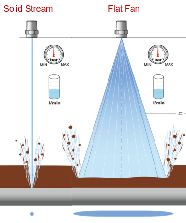 The type of nozzle being sprayed can influence impact. In the image below, a solid stream nozzle and flat fan nozzle spray from the same distance at the same pressure and flow rate. However, the solid stream nozzle provides more impact than the flat fan nozzle because the solid stream is concentrating more flow per area than the flat fan nozzle. The flat fan nozzle has a wider spray angle and the spray will provide you with more coverage but will concentrate more flow over a larger concentrated area.