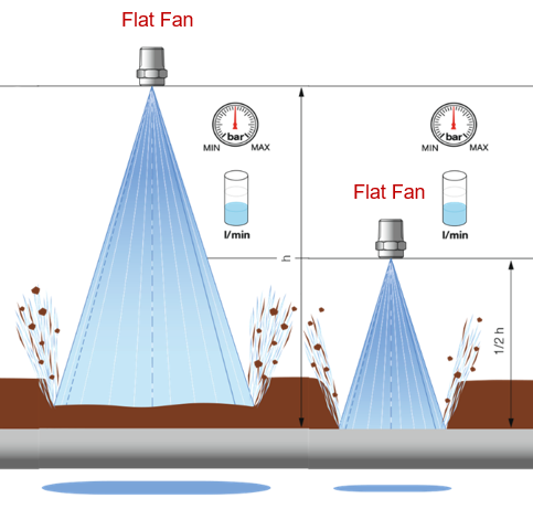Nozzle position can affect spray impact. In the image below, the flat fan nozzles have the same pressure and flow rate but one flat fan nozzle is placed at a shorter distance. At a shorter distance, the spray impact is greater because you are concentrating the same amount of flow in a smaller given surface area.