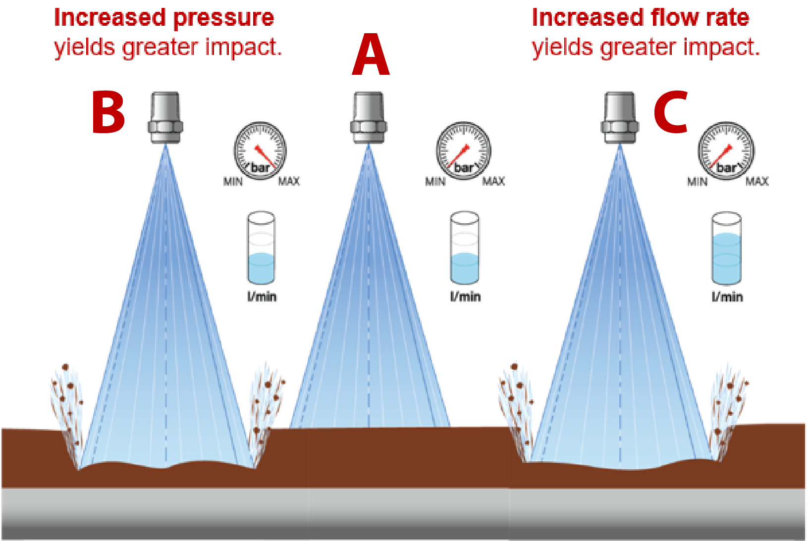 Now consider, Nozzle A and C in the image below, which are placed at the same distance and have the same pressure. However, the flow rate in this scenario for nozzle C is greater and results in higher impact at the target area. Increasing flow rate and/or pressure at the same distance will provide greater impact on the target area.