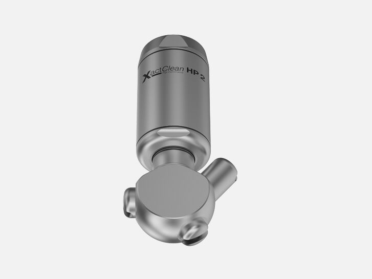 Specially developed flat jet nozzles provide the XactClean HP 2 with high impact and uniform cleaning. This is enhanced by its controlled and slow rotation, enabling an efficient cleaning process. The XactClean HP 2 is available with different spray angles and flow rates. It is also compatible with the Lechler rotating monitoring sensor.