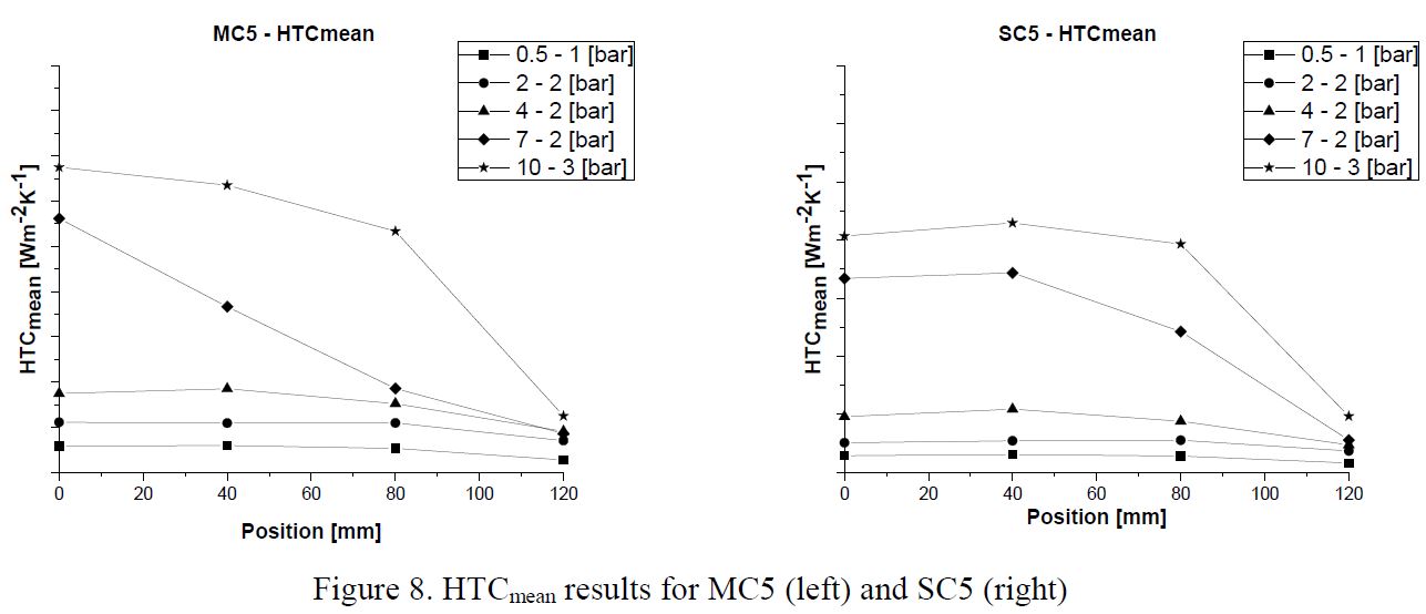 As mentioned before, for each set of parameters the local HTC was measured in four distances from the axial center of the spray cone. Figure 7 gives an overview of the resultant HTCmean for the nozzles MC3 and SC3. The HTCmean correlate with the measured water distribution profile and measurements with higher water/air pressure result in a higher HTCmean. Similar results are shown for the nozzles MC5 and SC5 in Figure 8.