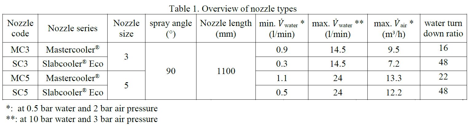 In both cases the maximum cooling performance of the Slabcooler Eco type nozzles is equivalent or improved compared to the Mastercooler nozzle type while for medium and low water flow rates equivalent cooling performances are achieved at reduced air consumption.